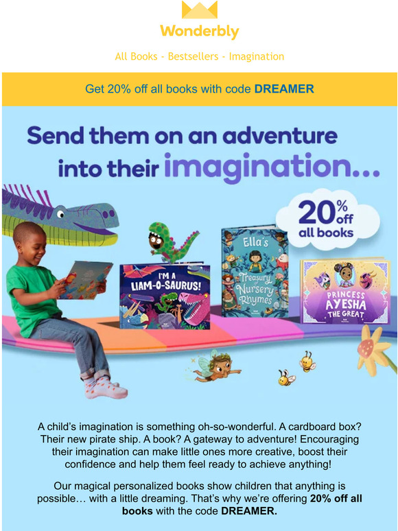 Wonderbly coupons & Discount codes Wonderbly Coupons & Discount Codes ; Ends tomorrow! Save 20% on new adventures with code DREAMER. Copy promo code ; Buddy up! Get $15 off when you introduce a ...