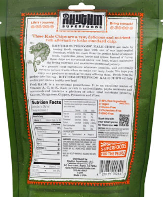 Rhythm Superfoods Organic Kale Chips Original -- 2 oz Autoship: $4.65 (5% off) Add to My List Details Tips & Recipes Rhythm Superfoods Organic Kale Chips Original Description Original Flavor Dried Not Fried 5g Protein Per Serving Excellent Source of Vitamins A + K Good Source of Fiber & Calcium Non-GMO Project Verified Certified Gluten-Free USDA Organic Vegan • Kosher Resealable Package