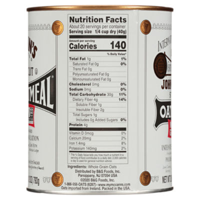 McCann's ® Traditional Steel Cut Irish Oatmeal McCann's® Traditional Steel Cut Irish Oatmeal For over 150 years, McCann's® has been warming the hearts, minds and souls of consumers with its classic Steel Cut Irish Oatmeal. Consumers from around the world can enjoy the rich texture and nutty flavor that is uniquely McCann's. 28 oz Nutrition Facts